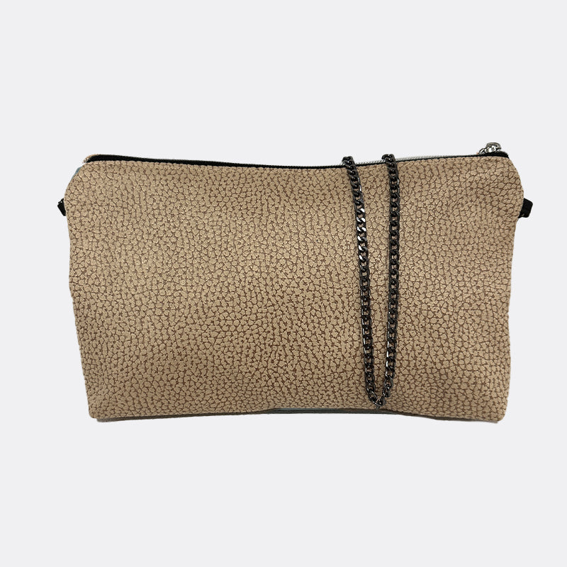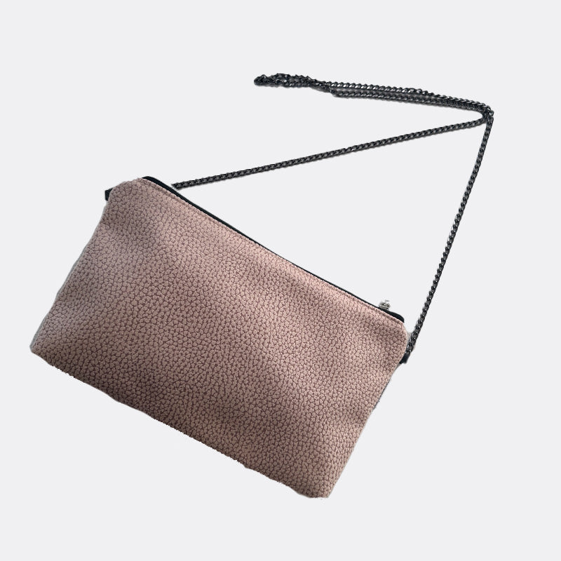 Bolso estilo bandolera, con asa en cadena y cierre en cremallera.