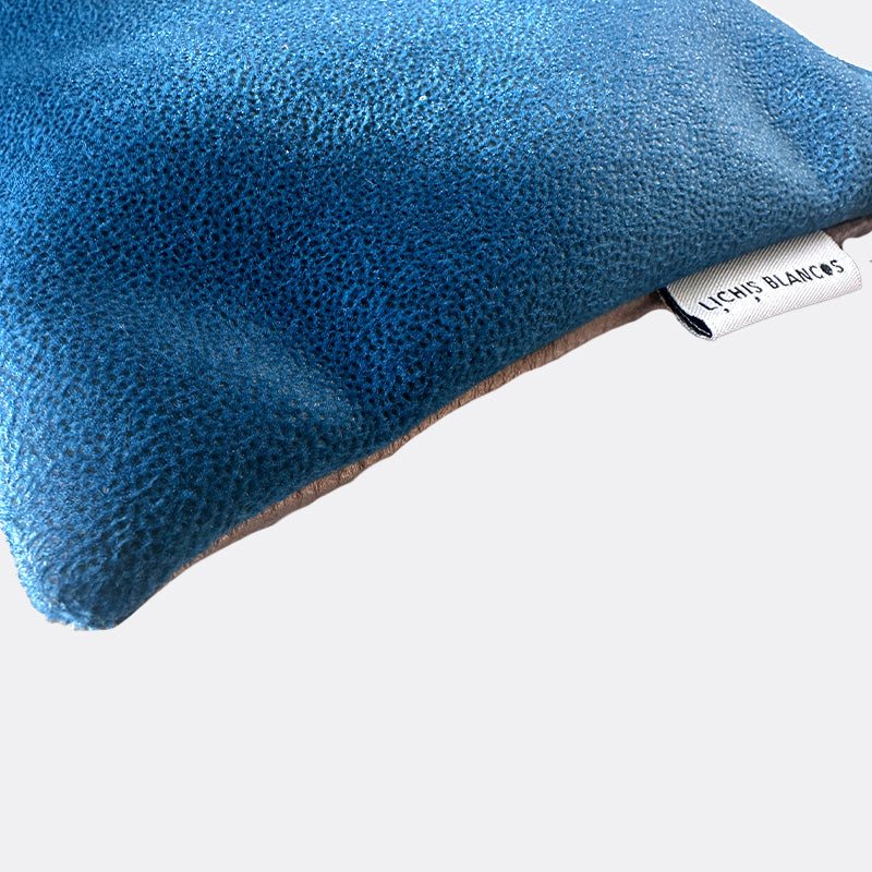 Tejido de terciopelo color agamarina y parte trasera en polipiel color tabaco.