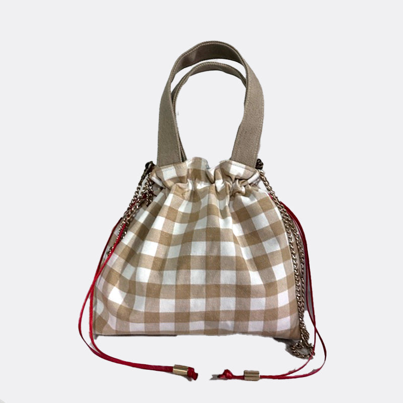 Bolso estilo bombonera con bolsillo interior. Asa de mano estampada de retales de tejidos y opción de asa en cadena con mosquetones.