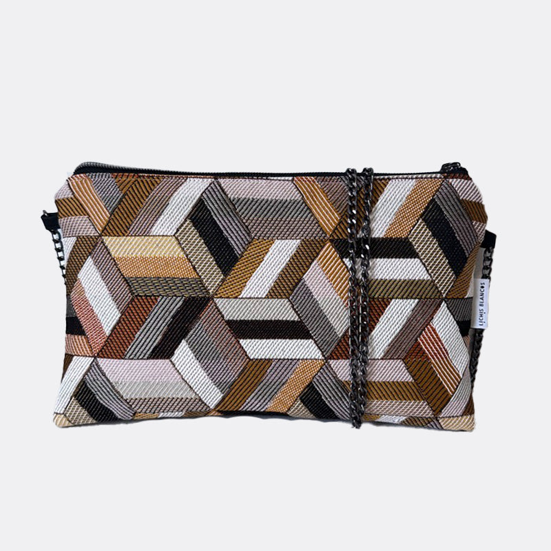 Bolso bandolera de tamaño pequeño, con abertura en cremallera. Asa en cadena.