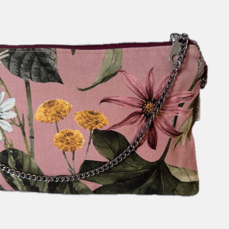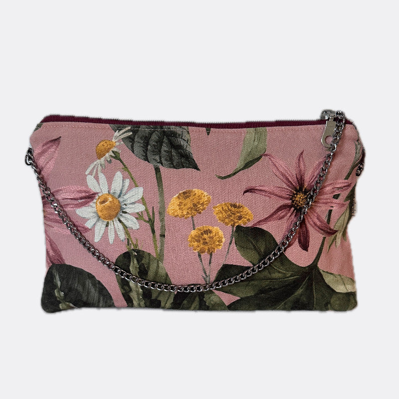 Bolso bandolera de tamaño pequeño, con abertura en cremallera. Asa en cadena.
