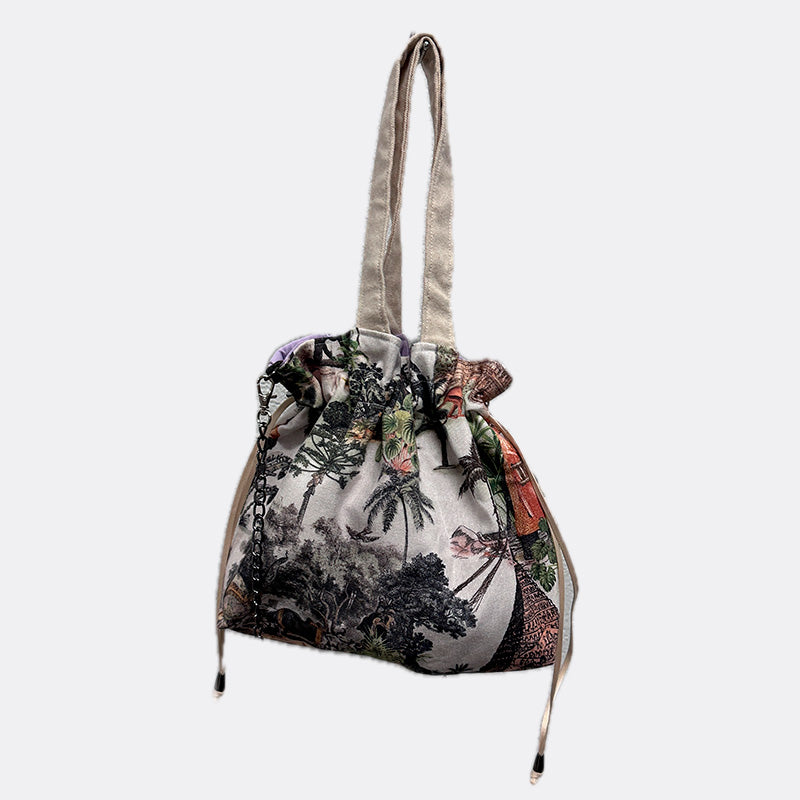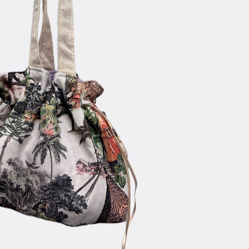 Bolso estilo bombonera con bolsillo interior. Asa de mano estampada de retales de tejidos y opción de asa en cadena con mosquetones.