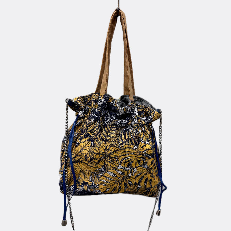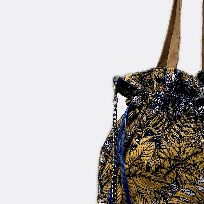 Bolso estilo bombonera con bolsillo interior. Asa de mano estampada de retales de tejidos y opción de asa en cadena con mosquetones.